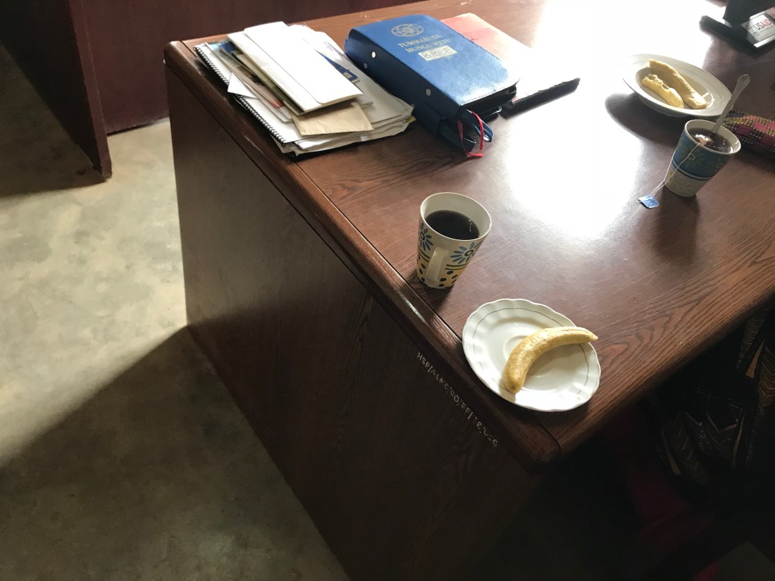 Oh, and the third picture here is of the treats they prepared for me. Coffee was instant, and the banana is a deep fat fried green banana. There’s only one deep fat fried green banana on the plate there; that’s because they gave me two, and I had to take a picture of it to give my stomach a break before I ate the second one. Not my fav delicacy, and you can be sure I’m not going to bring a plate of deep fat fried green bananas to the next Zion potluck, but my mama always taught me to eat what’s on your place because there are starving children in Africa, and since I’m in Africa, and since I’ve seen so many starving children, there was no choice but to eat it.