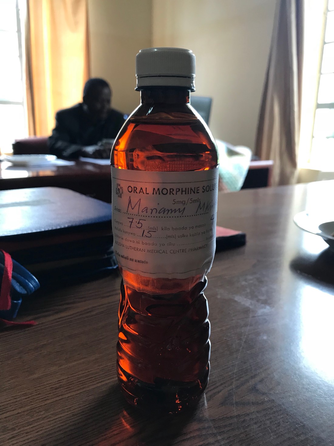 This is a picture of a used water bottle used to keep liquid oral morphine. Not knowing, I asked if the patient drank the whole thing, and they all had a knee slapping laugh at my expense, and said that no, they drink about a half a teaspoon. Silly me.